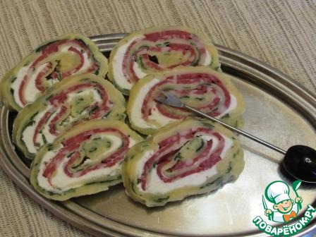 Толщину и ширину рулета регулируете по своему желанию - т. е. если хотите подать в виде канапе - делаете длинный и тонкий рулет, если в виде нарезки - более широкий рулет. -