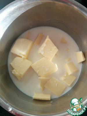 В кастрюлю заливаем молоко, добавляем масло и шоколад, подогреваем на маленьком огне пока масло и шоколад не растают. Остужаем.