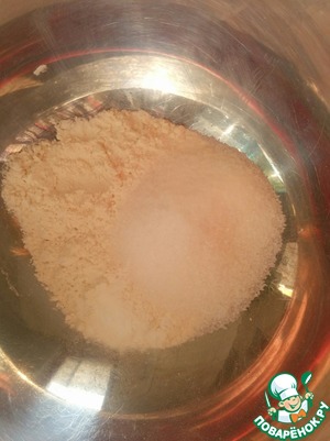 В миску насыпаем муку, пекарский порошок, сахар, маленькую щепотку соли и смешиваем.