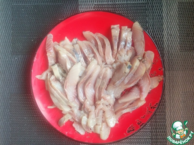 Филе сельди нарезаем небольшими кусочками.
