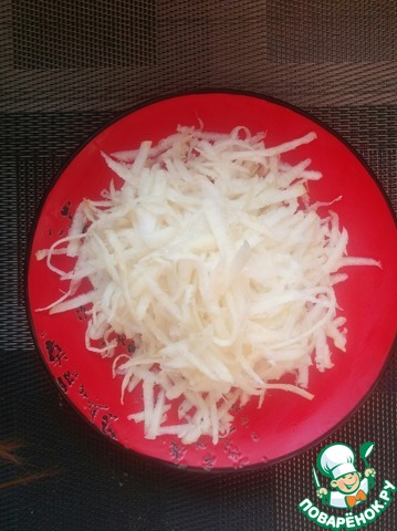 Сельдерей трем на крупной тёрке. Поливаем ложкой лимонного сока.
