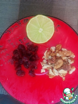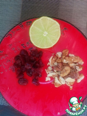 Клюкву (можно заменить изюмом) заливаем на пару минут кипятком. Орехи измельчить и немного поджарить на сухой сковороде.