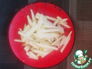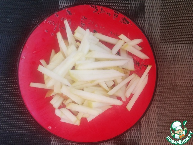 Яблко нарезаем соломкой. Поливаем ложкой лимонного сока.