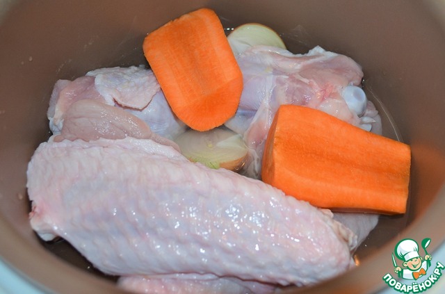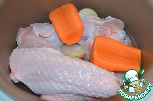 Сварить крылья индюшки, в минимальном количестве воды. Добавить морковь и луковицу, слегка присолить. Учтите, мы будем добавлять соевый соус. Я варила в мультиварке, 2 часа на режиме "Рагу, Тушение".