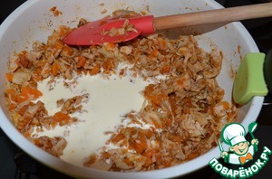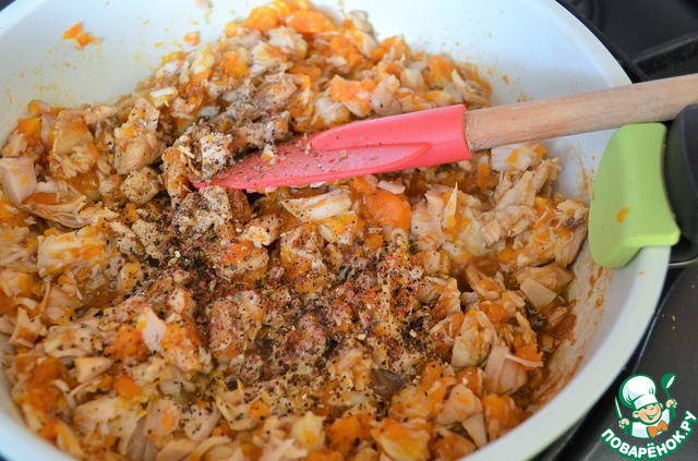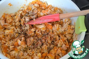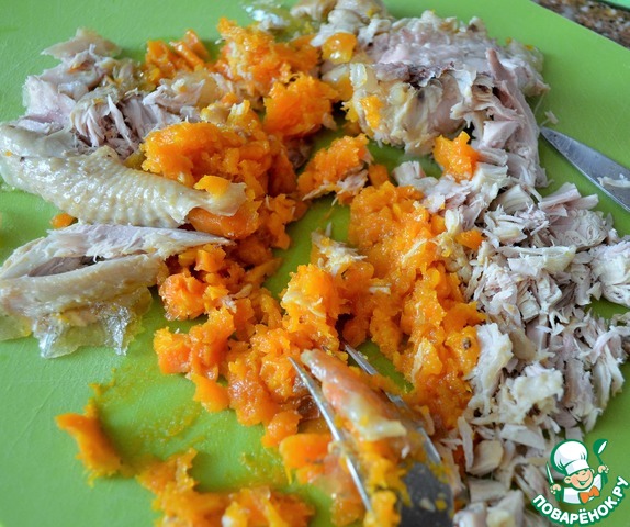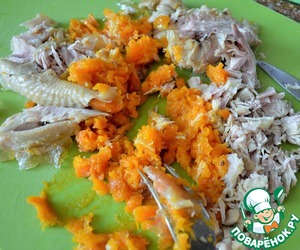 Дать остыть. Затем, убрав косточки, нарубить мясо мелко на волокна. Морковь и лук измельчить вилкой.