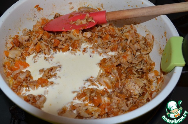 Влить сливки, перемешать, прокипятить на малом огне и выключить. Остудить.