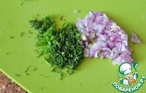 Нарубить мелко красный лук и зелень. Добавить в остывший рийет. Перемешать. Довести соль по вкусу. Я не солила.