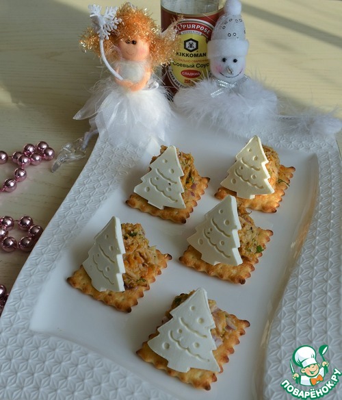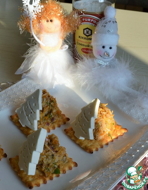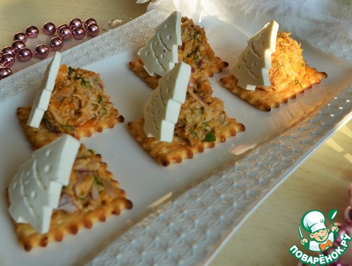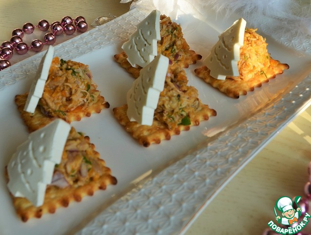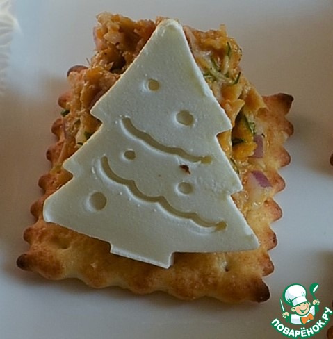 Выкладывать на крекер по 1 ч. л. рийета и оформить елочкой из сыра фета.