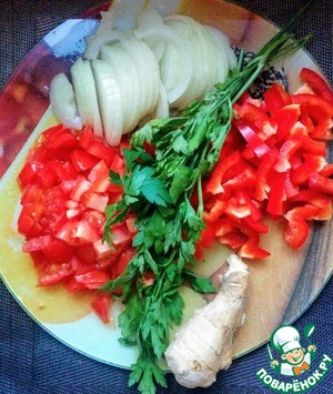 Лук обжариваем на растительном масле до прозрачности, ложим помидоры, перец, тертый на крупной терке имбирь, тушим 10 мин, периодически помешивая. В конце добавляем порезанные петрушку и чеснок.