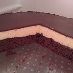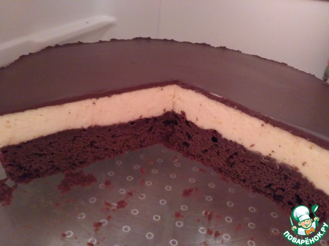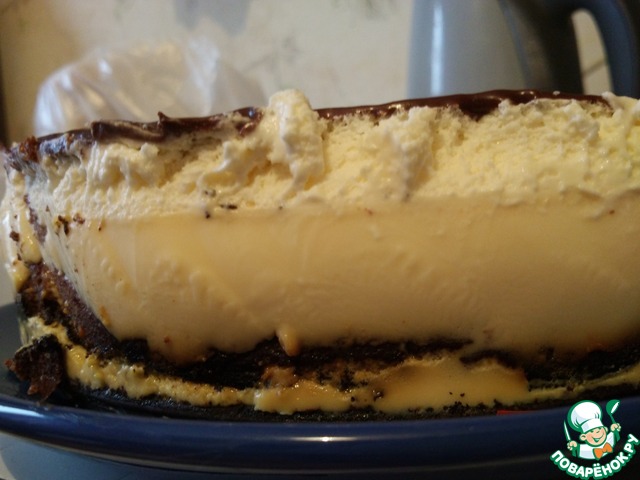 В итоге, жидкость из суфле затекла в коржик, он немного размяк, а пена сверху не дала хорошо размазать глазурь сверху. Но на срезе зато интересно смотрится: белый слой пены и ниже слой желе, в которое превратилась жидкость. Фотка прикрепилась в комментарий выше.