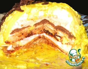 Покрываем печенье слоем йогурта, опять выкладываем парочку слоев печенья и покрываем все слоем шоколада.