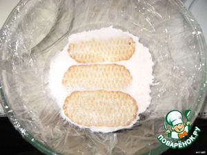 На дно выливаем первый слой йогурта, примерно 3 сантиметра, покрываем печеньем, которое предварительно необходимо окунуть в молоке.