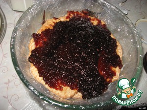 Поверх выливаем оставшийся йогурт, выкладываем слоем печенье, джем и наконец заключительный слой - печенье.
