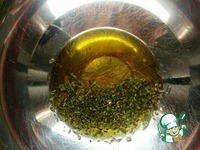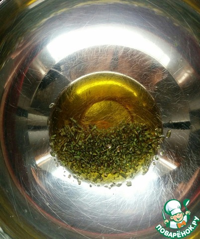 В миску вливаем оливковое масло, добавляем мелко нарезанные листики свежего розмарина ( можно заменить сухим). |