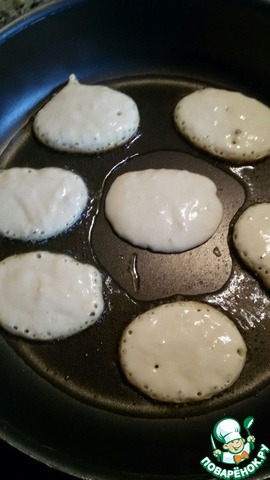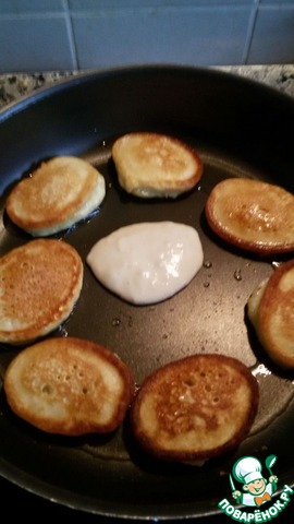 Уменьшаем огонь и когда на поверхности оладий появятся пузырьки, переворачиваем оладьи на другую сторону.