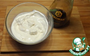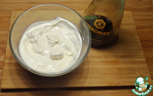 Смешать в миске творожный сыр, йогурт, лимонный сок и соевый соус.