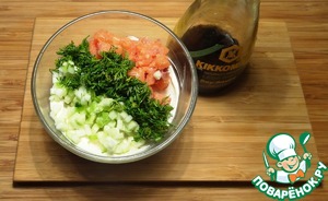 Добавить очень мелко нарезанные яблоко, семгу и часть укропа.