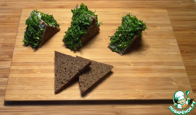 Ломтики Бородинского хлеба без корок нарезать треугольничками. Соединить попарно намазкой и украсить оставшимся укропом.