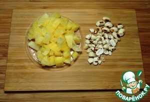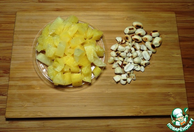 Ананас нарезать небольшими кусочками. Поджаренный и очищенный арахис крупно нарубить.
