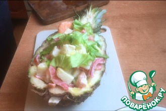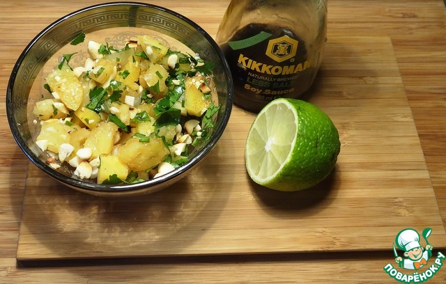 Смешать ананас, арахис и мелко рубленную кинзу. Добавить молотый острый перец. Заправить смесью сока лайма и соевого соуса. Количество острого перца регулируйте под себя, но совсем убирать его не советую.