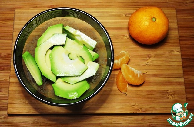 Авокадо очистить, нарезать ломтиками и сбрызнуть лимонным соком, чтобы не темнело. Мандарины очистить и разобрать на дольки.