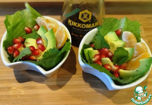 Выложить на листья салата авокадо, мандарин и зерна граната. Заправить смесью лимонного сокоа, соевого соуса и оливкового масла. Украсить листиками кинзы.