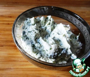 Пока профитроли остывают, смешать творожный сыр, козий сыр, тертый чеснок и мелко нарубленную петрушку.