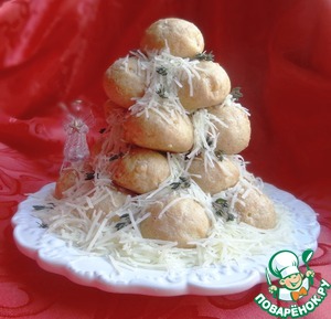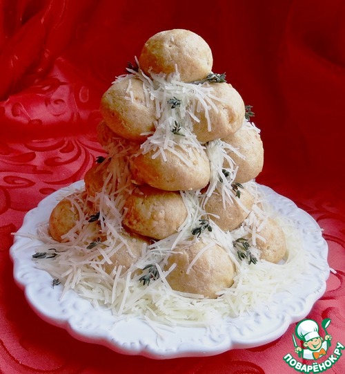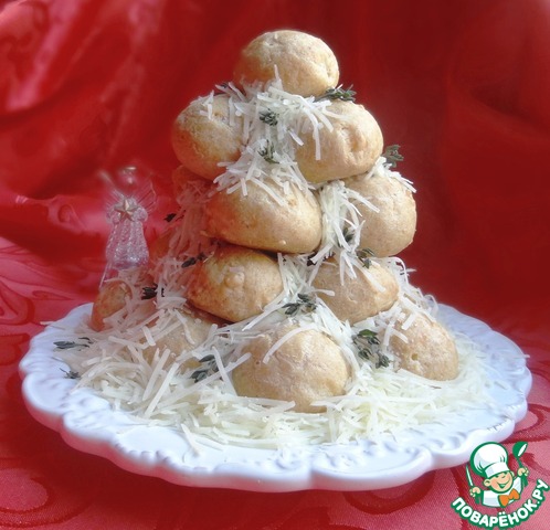 Замечательное сочетание сырных профитролей, крема с небольшой остротой козьего сыра и чеснока. И "снег" тоже сырный. Просто праздник!