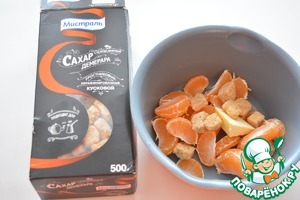 В сотейник сложите дольки мандарина, сахар (у меня сахар "Мистраль") и сливочное масло.