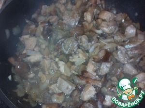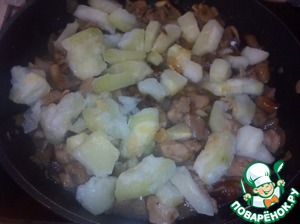 5. Нарезаем грибочки на небольшие кусочки и добавляем к мясу с луком, тушим 2-3 минуты.