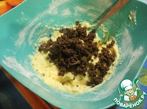 Смешать сухие ингредиенты (мука, сахар, разрыхлитель, соль) и размягчённое масло.