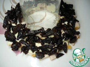 Нанести на слой куриного мяса майонез. Сверху выложить мелко нарезанный чернослив.