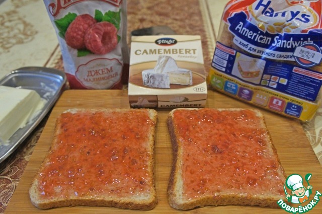 • Кусочки тостового хлеба (у меня хлеб с отрубями) намазать джемом.