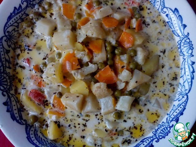 Добавить цветную капусту и горошек. Посолить и поперчить по вкусу. Снова довести до кипения и варить еще 10 минут.