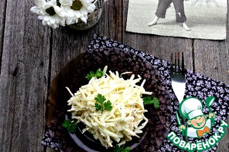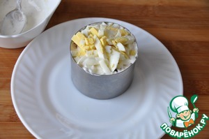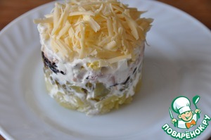 Посыпаем салат сверху тёртым сыром, снимаем кольцо.