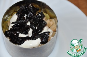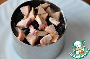 На чернослив кладём нарезанную кубиками мякоть копчёной курицы.
