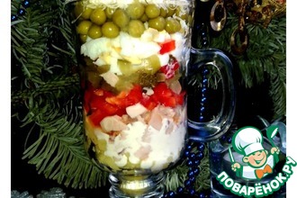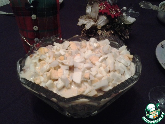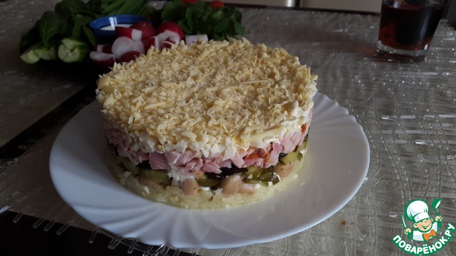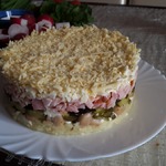Готовила по рецепту, вкладывая слоями ингредиенты в большой салатник. Вкус свежий, не избитый, сбалансированный. Единственное - не нашлось в холодильнике шампиньонов. Думаю,если сделать с грибами, будет ещё вуснее и ярче.
