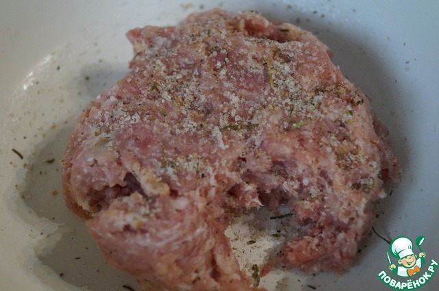 Возьмите любой фарш на Ваш вкус, у меня был свиной. Посолите по вкусу и заправьте специями.