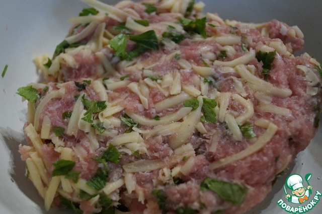 В мясной фарш добавьте 100 г сыра и петрушку. Тщательно перемешайте.