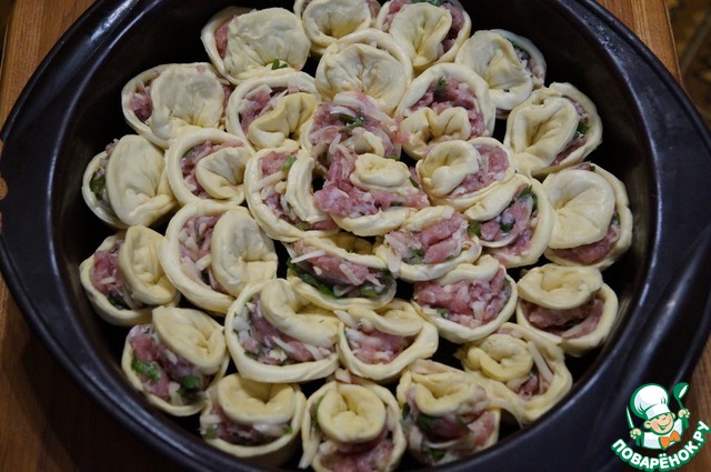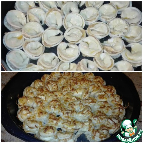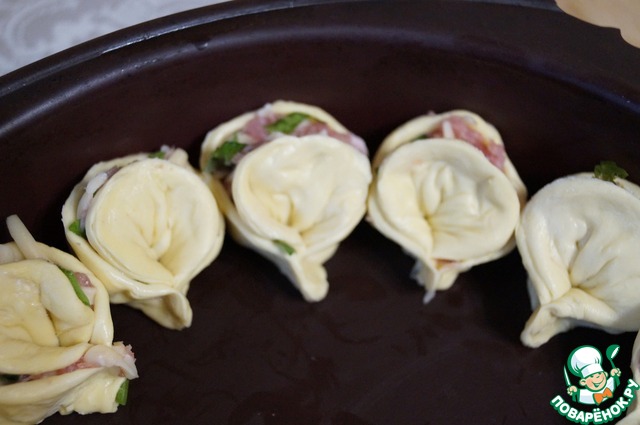 "Пельмешки" сложите в форму для выпечки по кругу, укладывая плотно друг к другу. Форма у меня силиконовая - 22см.