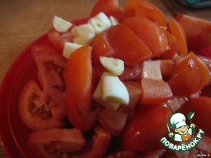 Сначала обжариваем помидоры с чесноком, потом добавляем морковь и вынимаем проваренное мясо (воду, где оно варилось сливаем).
