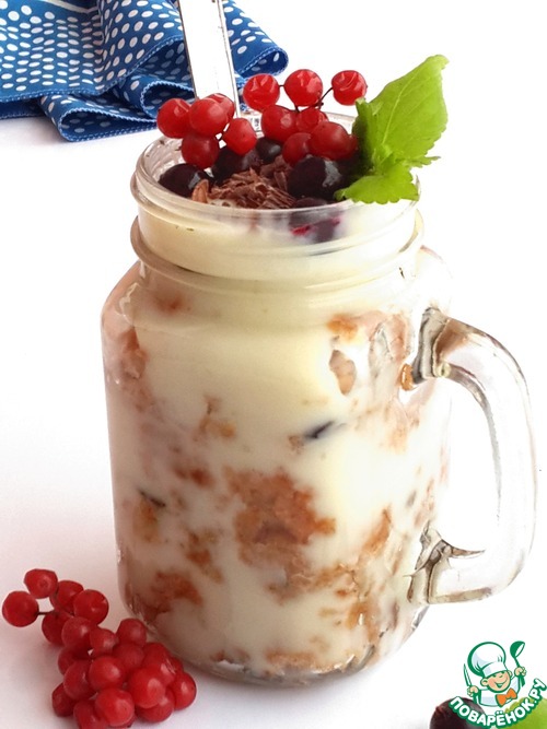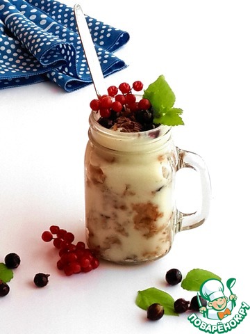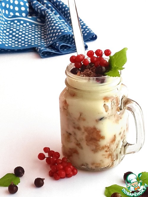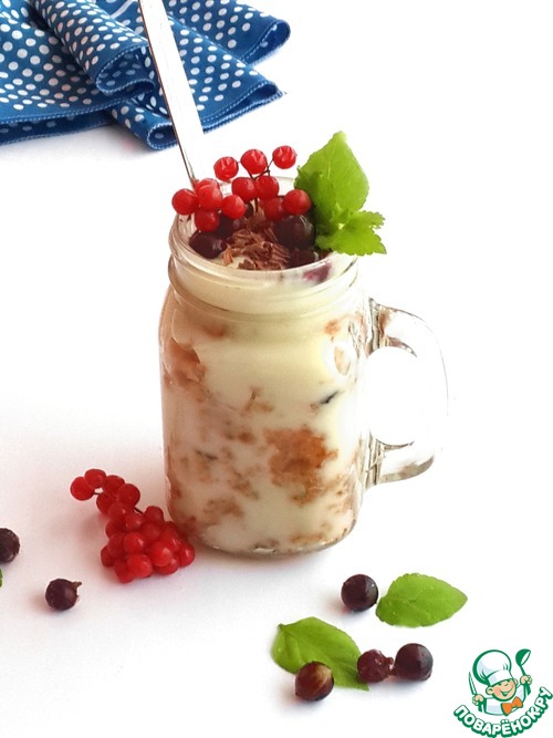 В бокал (или баночку как у меня) выкладывайте слоями кусочки пропитанной коврижки и заварной крем. Уберите в холодильник на 1-2 часа для пропитывания!