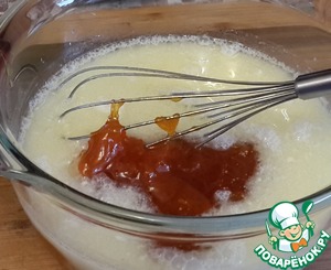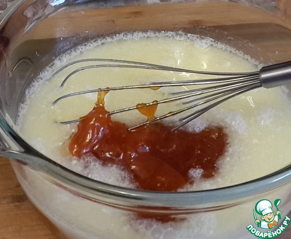 Яйцо, сахар, молоко и масло смешайте венчиком до растворения сахара, добавьте абрикосовый джем
