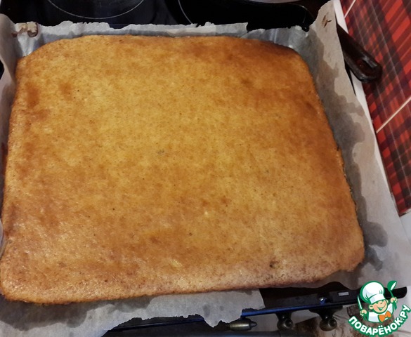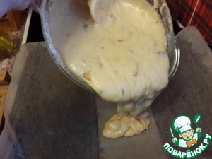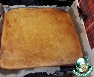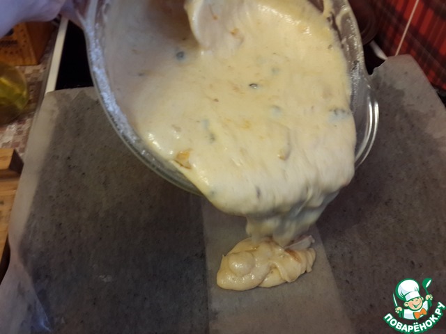 На противень, застеленный промасленным пергаменом вылейте тесто и поставьте в духовку -