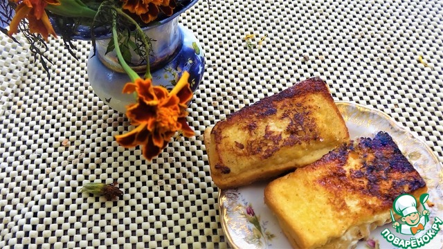 Выложить гренки на разогретую сковороду с небольшим количеством сливочного масла. Обжарить гренки с двух сторон на среднем огне, чтобы они не подгорели, но сыр успел расплавиться. Готовые гренки присыпать сахарной пудрой.