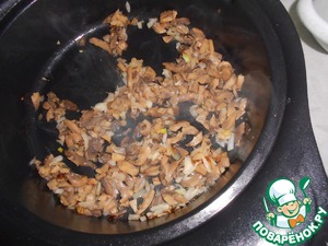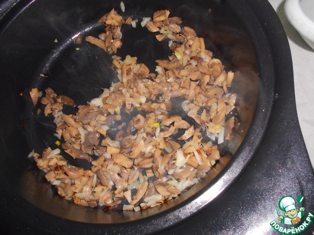 Лук очистите и мелко нарежьте. Грибы мелко нарежьте. На растительном масле обжарьте грибы с с луком, посолите, поперчите.