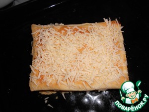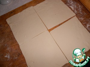 Слоеное тесто заранее разморозьте, раскатайте и нарежьте на 4 квадрата. Выпекайте в разогретой до 220 градусов в духовке в течении 15 минут.