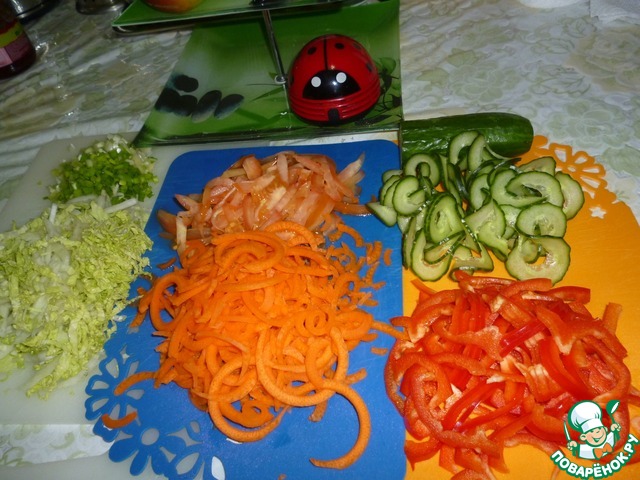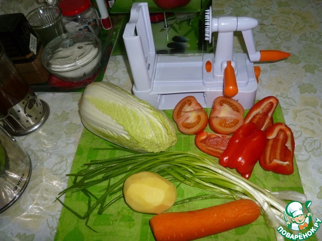 Не умею я пошаговые рецепты делать! Но попытаюсь!!! Итак, берём набор продуктов (на заднем плане: шайтан-машина, превращающая овощи в спагетти!).