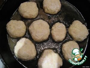 Скатываем шарики, немного расплющиваем, обваливаем в муке (собственно формируем обыкновенные сырнички), обжариваем в масле.