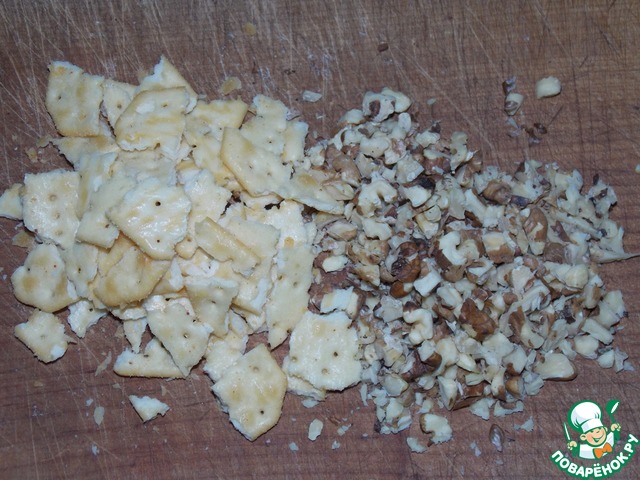 Орехи поджарить и мелко нарезать, печенье поломать на маленькие кусочки.